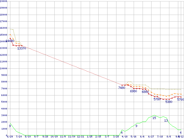 | Athlon X2 4600 (2.4GHz,L2 512KB×2)の価格推移 | | | (2007年6月29日~2008年9月12日) |