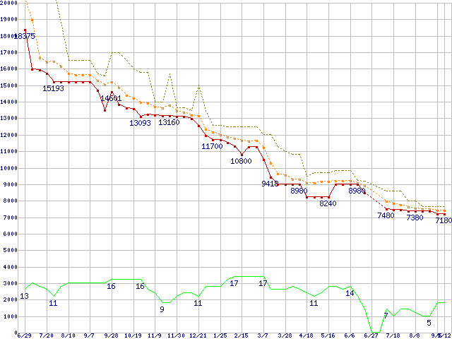 | Athlon 64 X2 5000+ (2.6GHz,L2 512KB×2)の価格推移 | | | (2007年6月29日~2008年9月12日) |
