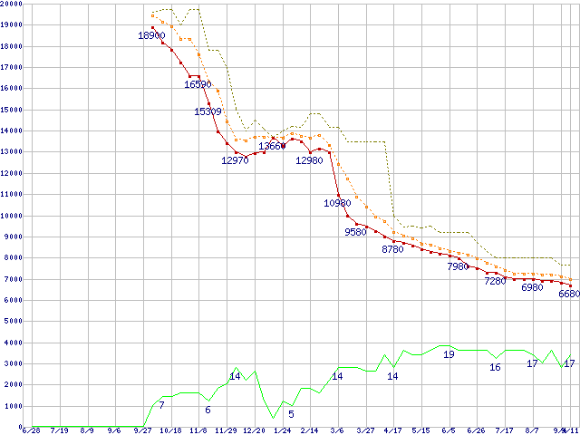 ※このグラフは過去のデータも税率5%相当に調整した税込み相当額のグラフです。 税率変更や、総額表示方式導入(2004年4月)の影響は除いています。 | | | ●凡例 | 最安値 (点線部は販売店未確認 または未調査) | 平均値 | 最高値 | ショップ数 |