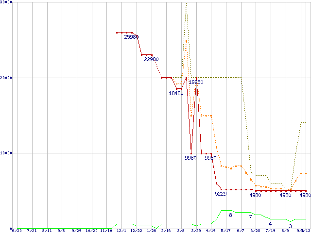 ※このグラフは過去のデータも税率5%相当に調整した税込み相当額のグラフです。 税率変更や、総額表示方式導入(2004年4月)の影響は除いています。 | | | ●凡例 | 最安値 (点線部は販売店未確認 または未調査) | 平均値 | 最高値 | ショップ数 |