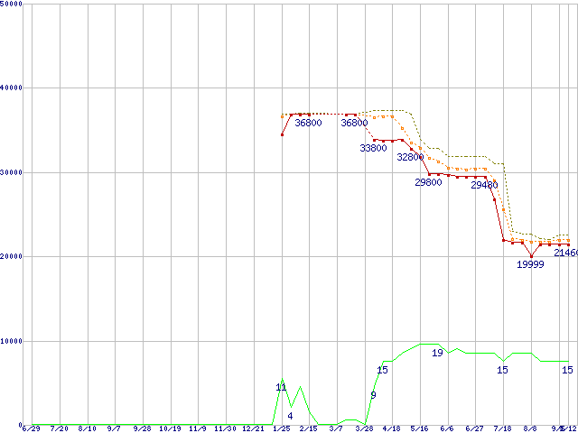 | Core 2 Duo E8500 (3.16GHz,L2 6MB)の価格推移 | | | (2007年6月29日~2008年9月12日) |