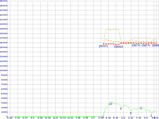 ※このグラフは過去のデータも税率5%相当に調整した税込み相当額のグラフです。 税率変更や、総額表示方式導入(2004年4月)の影響は除いています。 | | | ●凡例 | 最安値 (点線部は販売店未確認 または未調査) | 平均値 | 最高値 | ショップ数 |