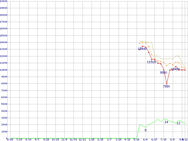| Athlon X2 5600 (2.9GHz,L2 512KB×2)の価格推移 | | | (2007年6月29日~2008年9月12日) |