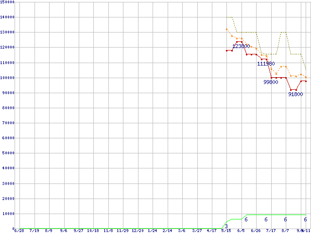 ※このグラフは過去のデータも税率5%相当に調整した税込み相当額のグラフです。 税率変更や、総額表示方式導入(2004年4月)の影響は除いています。 | | | ●凡例 | 最安値 (点線部は販売店未確認 または未調査) | 平均値 | 最高値 | ショップ数 |