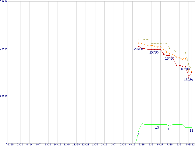| Phenom X3 8750 (2.4GHz,L2 512KB×3,L3 2MB)の価格推移 | | | (2007年6月29日~2008年9月12日) |