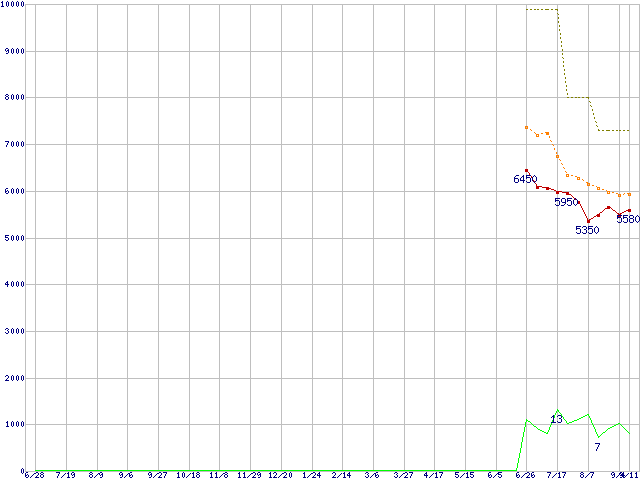 | HTS543216L9A300 (160GB,8MB)の価格推移 | | | (2007年6月28日~2008年9月11日) |