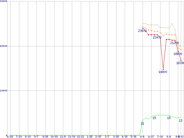 | Phenom X4 9750 (2.4GHz,L2 512KB×4,L3 2MB,TDP 95W)の価格推移 | | | (2007年6月29日~2008年9月12日) |
