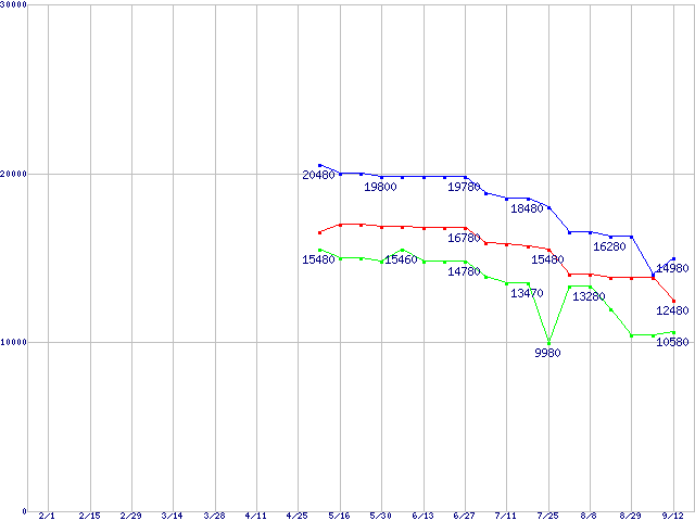 | Socket AM2 (HyperTransport 3.0,Triple Core,TDP 95W)の最安値推移 | | | (2008年2月1日~2008年9月12日) |
