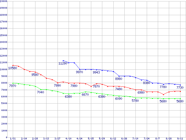 WD Caviar Blue (7200rpm,3Gb/s,16MB)の最安値推移