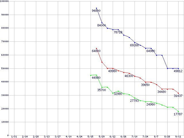| MasterDrive MX SATA-II 25 (SSD,1.5Gb/s,2.5インチ)の最安値推移 | | | (2008年1月31日~2008年9月11日) |