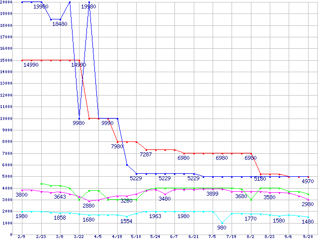 メモリ主要製品(最安値5千円未満)の最安値推移