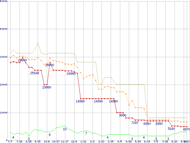 ※このグラフは過去のデータも税率5%相当に調整した税込み相当額のグラフです。 税率変更や、総額表示方式導入(2004年4月)の影響は除いています。 | | | ●凡例 | 最安値 (点線部は販売店未確認 または未調査) | 平均値 | 最高値 | ショップ数 |