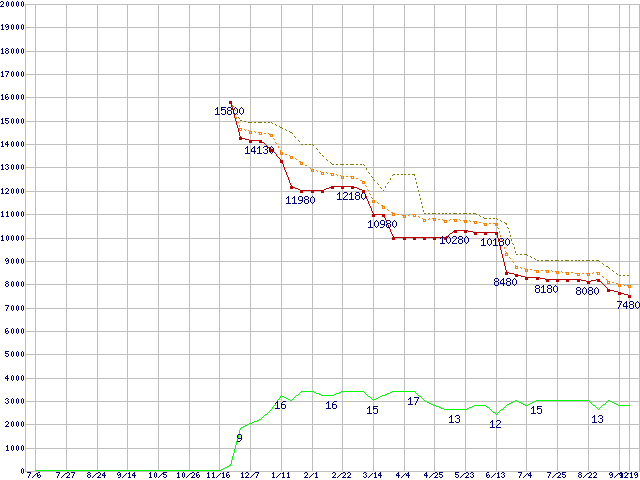 | Athlon X2 5200 (2.7GHz,L2 512KB×2)の価格推移 | | | (2007年7月6日~2008年9月19日) |
