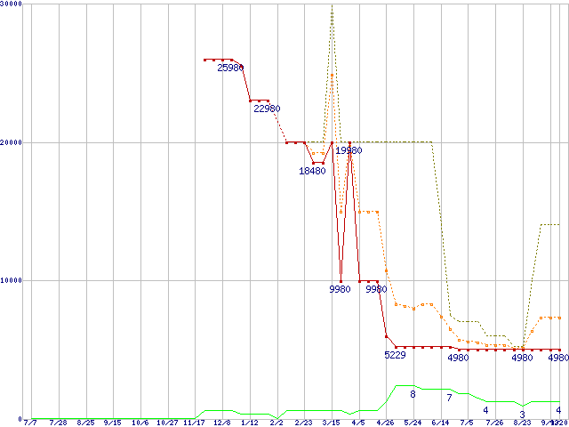 ※このグラフは過去のデータも税率5%相当に調整した税込み相当額のグラフです。 税率変更や、総額表示方式導入(2004年4月)の影響は除いています。 | | | ●凡例 | 最安値 (点線部は販売店未確認 または未調査) | 平均値 | 最高値 | ショップ数 |