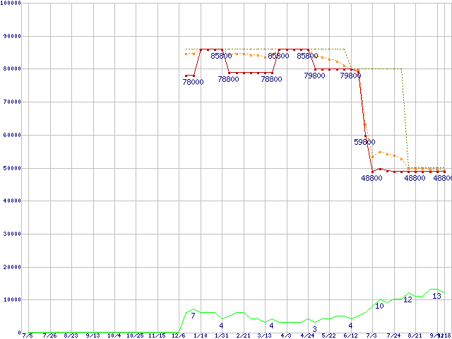 ※このグラフは過去のデータも税率5%相当に調整した税込み相当額のグラフです。 税率変更や、総額表示方式導入(2004年4月)の影響は除いています。 | | | ●凡例 | 最安値 (点線部は販売店未確認 または未調査) | 平均値 | 最高値 | ショップ数 |
