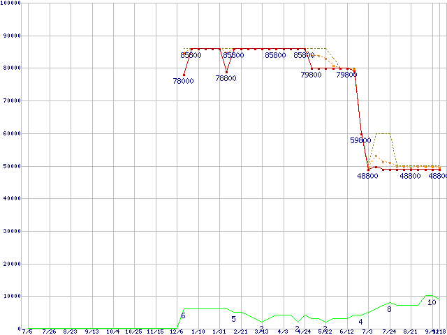 ※このグラフは過去のデータも税率5%相当に調整した税込み相当額のグラフです。 税率変更や、総額表示方式導入(2004年4月)の影響は除いています。 | | | ●凡例 | 最安値 (点線部は販売店未確認 または未調査) | 平均値 | 最高値 | ショップ数 |