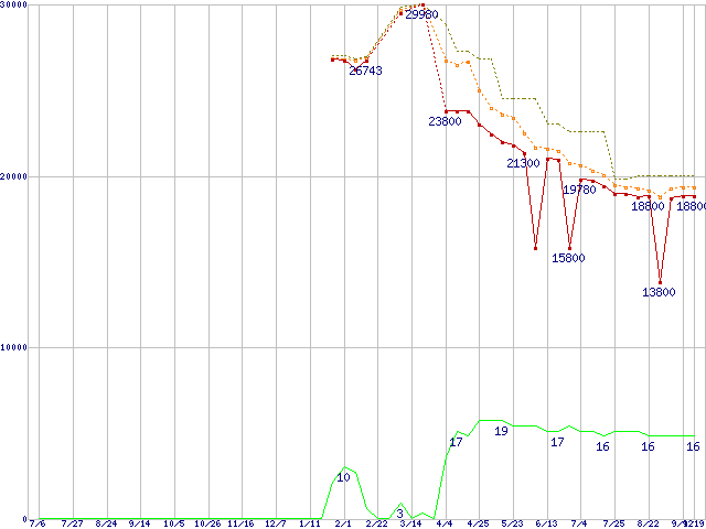 | Core 2 Duo E8400 (3GHz,L2 6MB)の価格推移 | | | (2007年7月6日~2008年9月19日) |