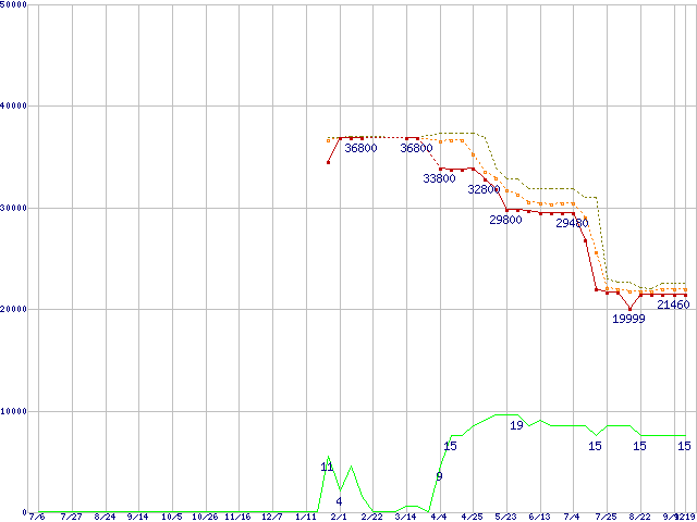 | Core 2 Duo E8500 (3.16GHz,L2 6MB)の価格推移 | | | (2007年7月6日~2008年9月19日) |