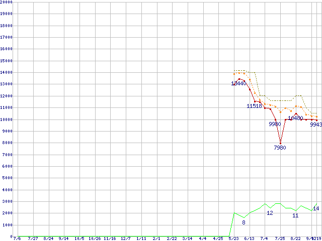 | Athlon X2 5600 (2.9GHz,L2 512KB×2)の価格推移 | | | (2007年7月6日~2008年9月19日) |