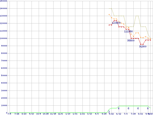 ※このグラフは過去のデータも税率5%相当に調整した税込み相当額のグラフです。 税率変更や、総額表示方式導入(2004年4月)の影響は除いています。 | | | ●凡例 | 最安値 (点線部は販売店未確認 または未調査) | 平均値 | 最高値 | ショップ数 |