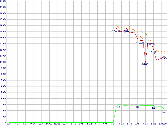 ※このグラフは過去のデータも税率5%相当に調整した税込み相当額のグラフです。 税率変更や、総額表示方式導入(2004年4月)の影響は除いています。 | | | ●凡例 | 最安値 (点線部は販売店未確認 または未調査) | 平均値 | 最高値 | ショップ数 |