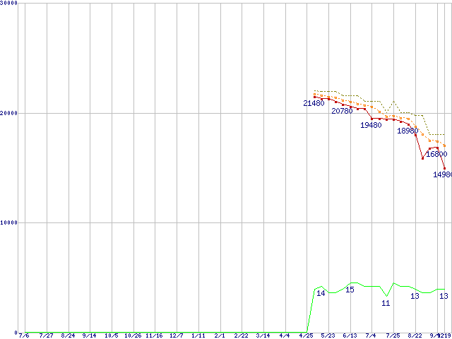 | Phenom X4 9550 (2.2GHz,L2 512KB×4,L3 2MB)の価格推移 | | | (2007年7月6日~2008年9月19日) |