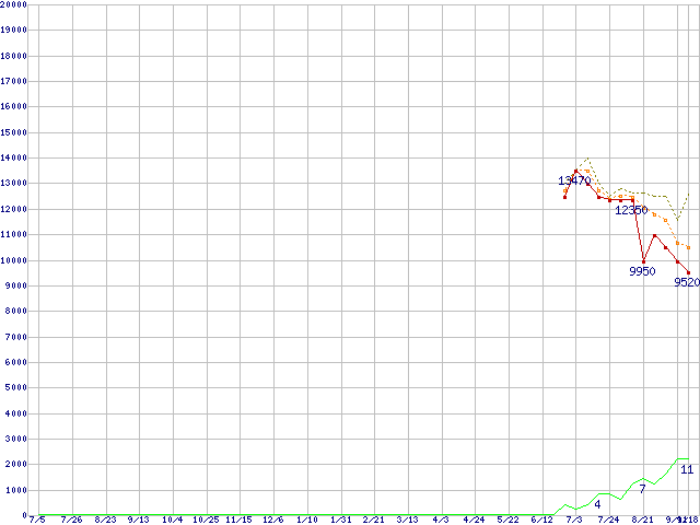 ※このグラフは過去のデータも税率5%相当に調整した税込み相当額のグラフです。 税率変更や、総額表示方式導入(2004年4月)の影響は除いています。 | | | ●凡例 | 最安値 (点線部は販売店未確認 または未調査) | 平均値 | 最高値 | ショップ数 |