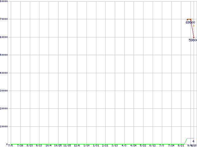 ※このグラフは過去のデータも税率5%相当に調整した税込み相当額のグラフです。 税率変更や、総額表示方式導入(2004年4月)の影響は除いています。 | | | ●凡例 | 最安値 (点線部は販売店未確認 または未調査) | 平均値 | 最高値 | ショップ数 |