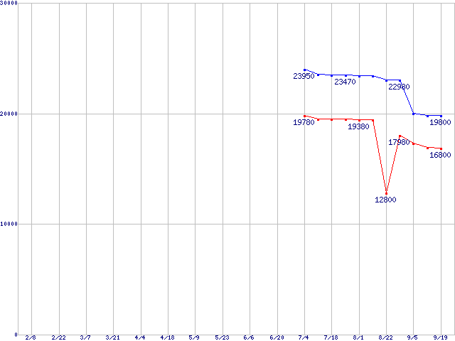 | Socket AM2 (HyperTransport 3.0,Quad Core,TDP 65W)の最安値推移 | | | (2008年2月8日~2008年9月19日) |
