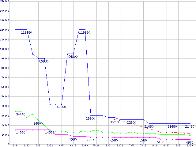 PC3-12800(DDR3-1600) DDR3 SDRAM DIMMの最安値推移