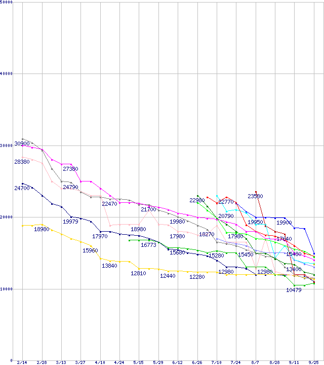 | HDD/SSD主要製品(最安値1万円~1万5千円未満)の最安値推移 | | | (2008年2月14日~2008年9月25日) |