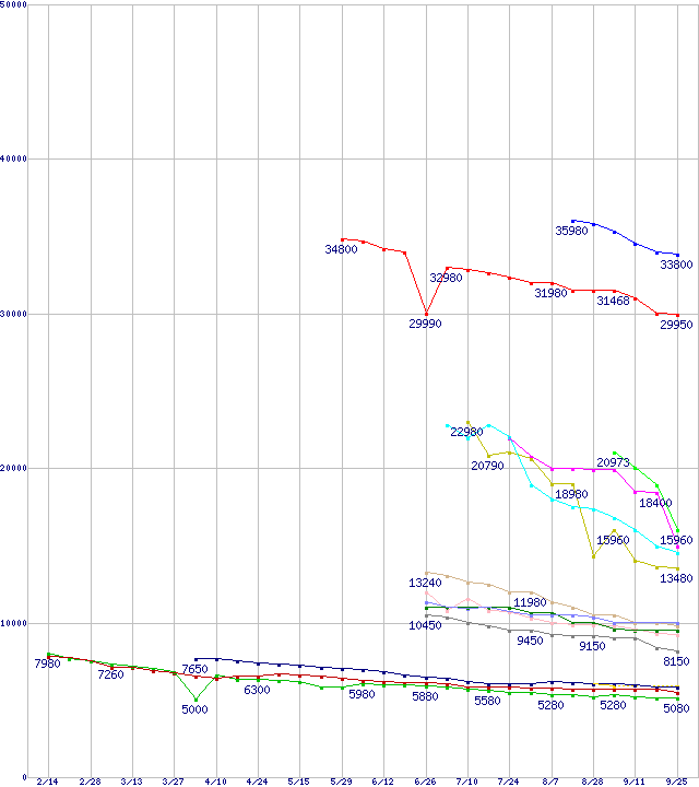 | HDD 300~400GB未満の最安値推移 | | | (2008年2月14日~2008年9月25日) |