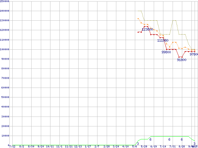 ※このグラフは過去のデータも税率5%相当に調整した税込み相当額のグラフです。 税率変更や、総額表示方式導入(2004年4月)の影響は除いています。 | | | ●凡例 | 最安値 (点線部は販売店未確認 または未調査) | 平均値 | 最高値 | ショップ数 |