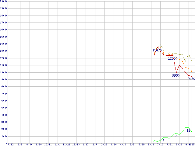 ※このグラフは過去のデータも税率5%相当に調整した税込み相当額のグラフです。 税率変更や、総額表示方式導入(2004年4月)の影響は除いています。 | | | ●凡例 | 最安値 (点線部は販売店未確認 または未調査) | 平均値 | 最高値 | ショップ数 |