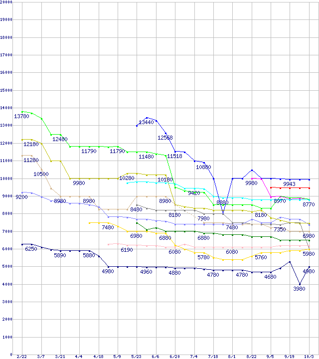 | CPU主要製品(最安値1万円未満)の最安値推移 | | | (2008年2月22日~2008年10月3日) |