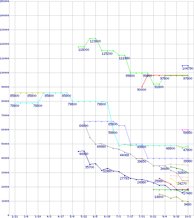 | HDD/SSD 30GB~80GB未満の最安値推移 | | | (2008年2月21日~2008年10月2日) |