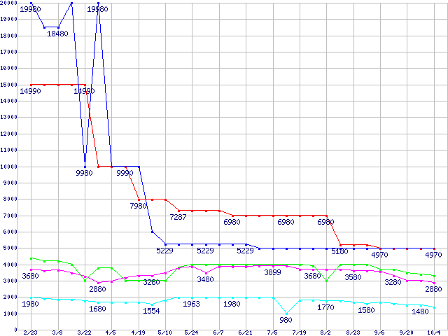 メモリ主要製品(最安値5千円未満)の最安値推移