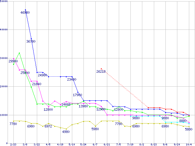 メモリ主要製品(最安値5千円未満)の最安値推移