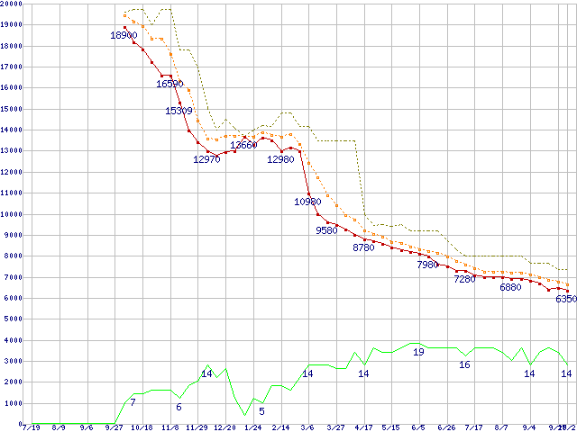 ※このグラフは過去のデータも税率5%相当に調整した税込み相当額のグラフです。 税率変更や、総額表示方式導入(2004年4月)の影響は除いています。 | | | ●凡例 | 最安値 (点線部は販売店未確認 または未調査) | 平均値 | 最高値 | ショップ数 |