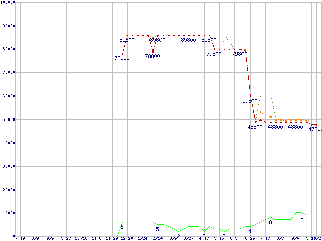 ※このグラフは過去のデータも税率5%相当に調整した税込み相当額のグラフです。 税率変更や、総額表示方式導入(2004年4月)の影響は除いています。 | | | ●凡例 | 最安値 (点線部は販売店未確認 または未調査) | 平均値 | 最高値 | ショップ数 |