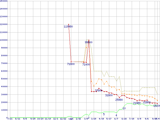 ※このグラフは過去のデータも税率5%相当に調整した税込み相当額のグラフです。 税率変更や、総額表示方式導入(2004年4月)の影響は除いています。 | | | ●凡例 | 最安値 (点線部は販売店未確認 または未調査) | 平均値 | 最高値 | ショップ数 |