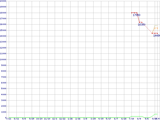 ※このグラフは過去のデータも税率5%相当に調整した税込み相当額のグラフです。 税率変更や、総額表示方式導入(2004年4月)の影響は除いています。 | | | ●凡例 | 最安値 (点線部は販売店未確認 または未調査) | 平均値 | 最高値 | ショップ数 |