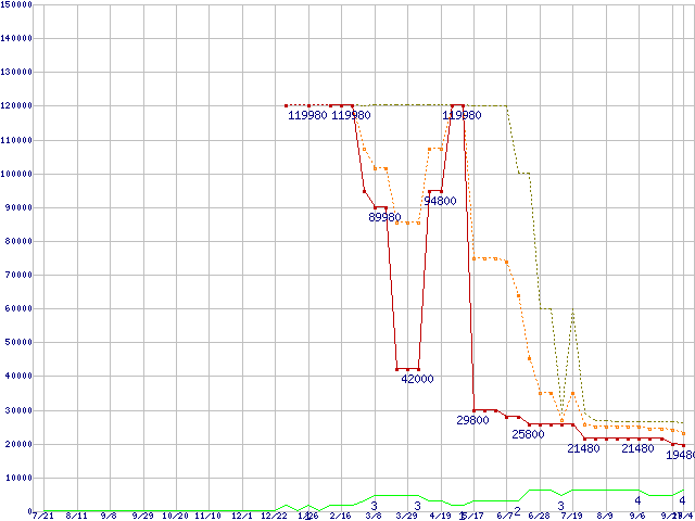 ※このグラフは過去のデータも税率5%相当に調整した税込み相当額のグラフです。 税率変更や、総額表示方式導入(2004年4月)の影響は除いています。 | | | ●凡例 | 最安値 (点線部は販売店未確認 または未調査) | 平均値 | 最高値 | ショップ数 |