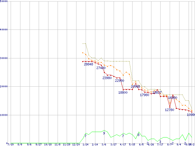 ※このグラフは過去のデータも税率5%相当に調整した税込み相当額のグラフです。 税率変更や、総額表示方式導入(2004年4月)の影響は除いています。 | | | ●凡例 | 最安値 (点線部は販売店未確認 または未調査) | 平均値 | 最高値 | ショップ数 |