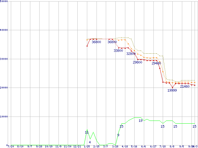 ※このグラフは過去のデータも税率5%相当に調整した税込み相当額のグラフです。 税率変更や、総額表示方式導入(2004年4月)の影響は除いています。 | | | ●凡例 | 最安値 (点線部は販売店未確認 または未調査) | 平均値 | 最高値 | ショップ数 |