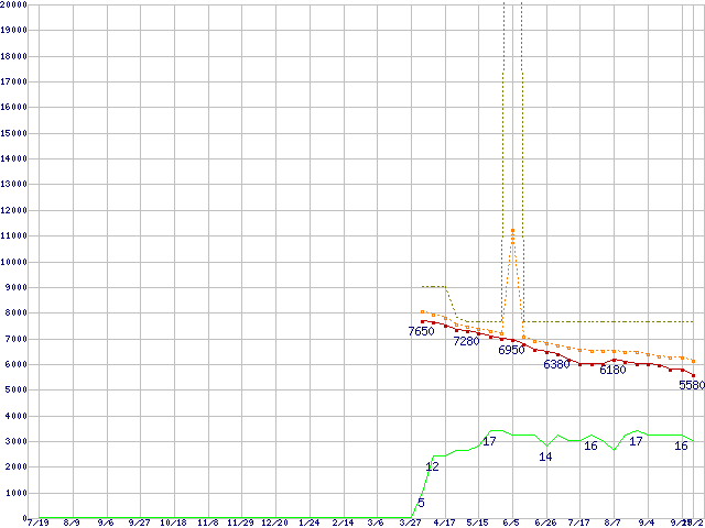 ※このグラフは過去のデータも税率5%相当に調整した税込み相当額のグラフです。 税率変更や、総額表示方式導入(2004年4月)の影響は除いています。 | | | ●凡例 | 最安値 (点線部は販売店未確認 または未調査) | 平均値 | 最高値 | ショップ数 |