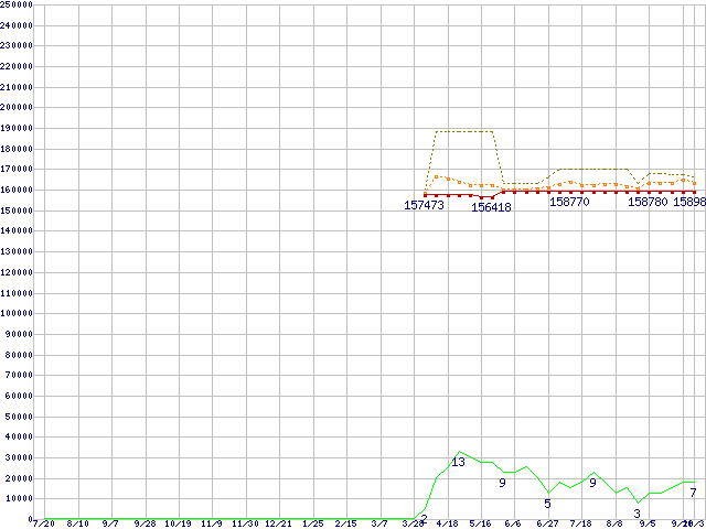 ※このグラフは過去のデータも税率5%相当に調整した税込み相当額のグラフです。 税率変更や、総額表示方式導入(2004年4月)の影響は除いています。 | | | ●凡例 | 最安値 (点線部は販売店未確認 または未調査) | 平均値 | 最高値 | ショップ数 |