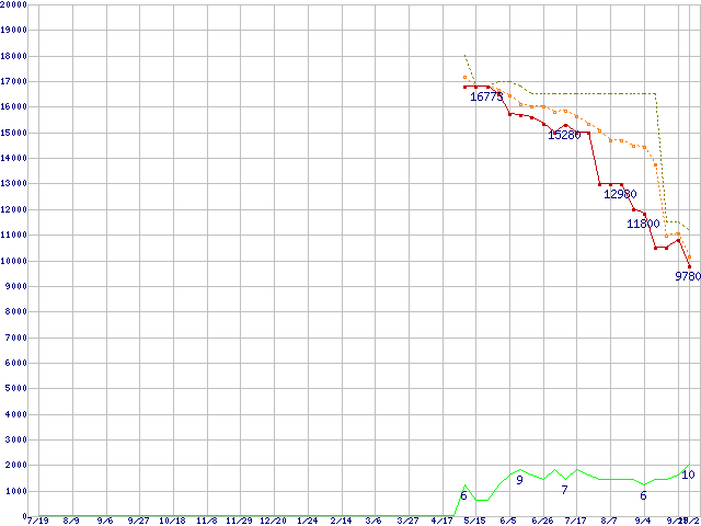 ※このグラフは過去のデータも税率5%相当に調整した税込み相当額のグラフです。 税率変更や、総額表示方式導入(2004年4月)の影響は除いています。 | | | ●凡例 | 最安値 (点線部は販売店未確認 または未調査) | 平均値 | 最高値 | ショップ数 |