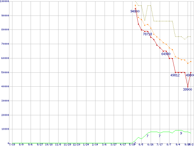 ※このグラフは過去のデータも税率5%相当に調整した税込み相当額のグラフです。 税率変更や、総額表示方式導入(2004年4月)の影響は除いています。 | | | ●凡例 | 最安値 (点線部は販売店未確認 または未調査) | 平均値 | 最高値 | ショップ数 |