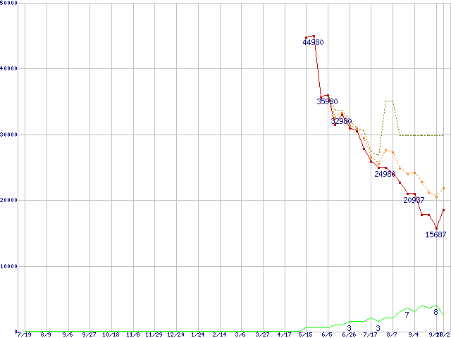 ※このグラフは過去のデータも税率5%相当に調整した税込み相当額のグラフです。 税率変更や、総額表示方式導入(2004年4月)の影響は除いています。 | | | ●凡例 | 最安値 (点線部は販売店未確認 または未調査) | 平均値 | 最高値 | ショップ数 |